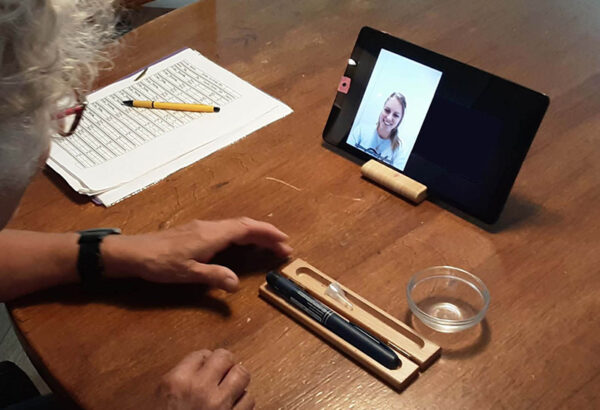 However Ffinding the ideal working practice method was a challenge, however. For the patient client, it had to be clear how she used the technology to make contact which steps she had to take in order to get in touch. “Here, you have to be creative”, says Anna, “so I stuck a pink square around the tablet’s camera and a dot on the tablet and a dot on the holder, so that it was always in the right position”.