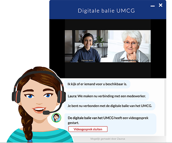 Laura will ask some basic questions and then refer the patient to a ‘real’ UMCG employee, who will then start a video call with the patient. The employee will then handle the rest of the registration process, by asking for the patient’s Social Security Number and health insurance card and checking the patient’s ID. When everything is in order, the patient will receive a registration code for the hospital’s patient environment.